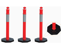 Tall (1.15 meter/4 feet) slim (10cm/4 inches) fluorescent red or orange plastic post & cone with reflective tape and removable heavy rubber bases are frequently used in road traffic control where traffic cones would be inappropriate due to their width and ease of movement. Also referred to as delineators, the bases are usually made from recycled rubber, and can be easily glued to the road surface to resist movement following minor impacts from passing traffic. Sometimes called “T-Top Bollards” from the T-bar molded into the top for tying tape, the bollard is an economical, cost effective and safe delineation system designed especially for motorways and busy arterial roads. In conjunction with plastic tape, it is also effective in pedestrian control.